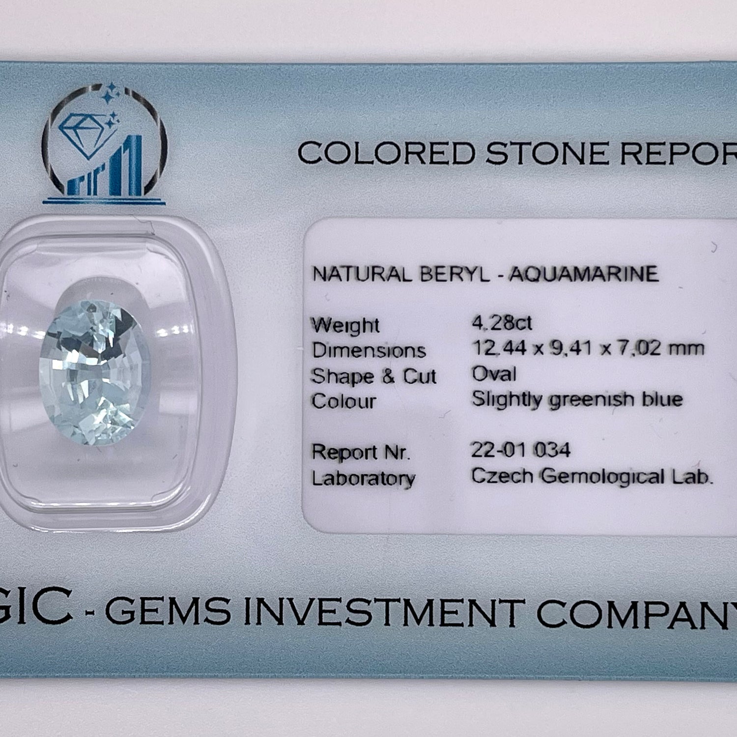 Natural Aquamarine 4.28 ct – Light Greenish Blue, Oval Brilliant Cut, Untreated, ČGL Certified