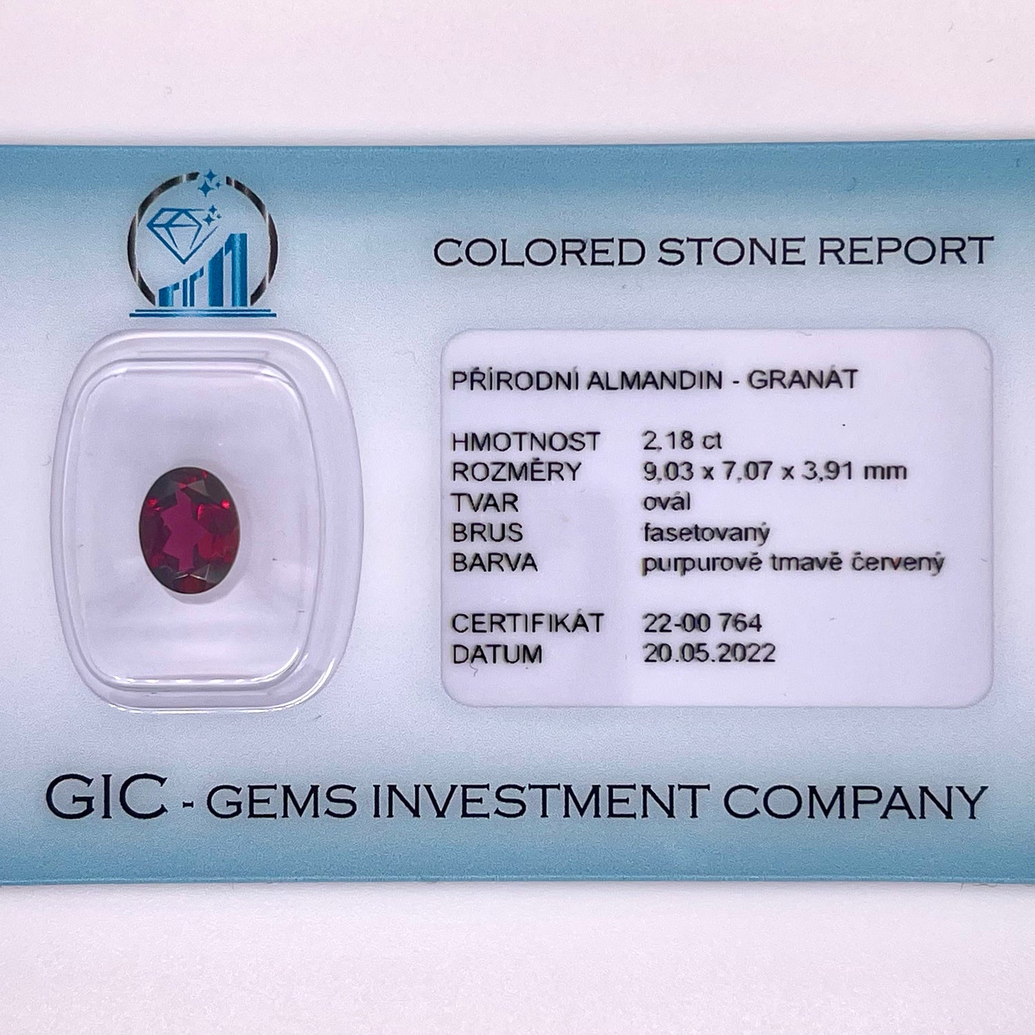 This 2.18 carat natural almandine garnet displays a purple to dark red hue, cut into an oval shape measuring 9.03 × 7.07 × 3.91 mm. With internally flawless (IF) clarity, the gemstone shows excellent transparency without visible inclusions. Untreated and naturally formed, it represents a fine example of almandine garnet with an uncommon clarity grade. Certified by the Czech Gemological Laboratory (ČGL), this gemstone comes with independent confirmation of its authenticity and natural origin. A suitable choice for collectors of garnets as well as for elegant custom jewelry pieces.