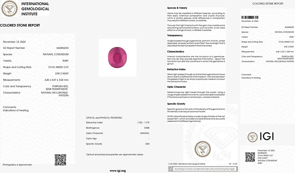This 0.92 carat Burmese ruby is cut into a classic oval shape (6.45 × 5.07 × 3.54 mm) with a faceted finish. Originating from Myanmar, this gemstone displays a rich purplish-red hue with strong saturation and clarity, enhanced by traditional heat treatment. Certified by IGI, it comes with independent verification of authenticity and quality. With a Mohs hardness of 9, ruby is exceptionally durable and ideal for rings, pendants, or other fine jewelry. A refined choice for those seeking the prestige of a Burmese ruby at an accessible price point.