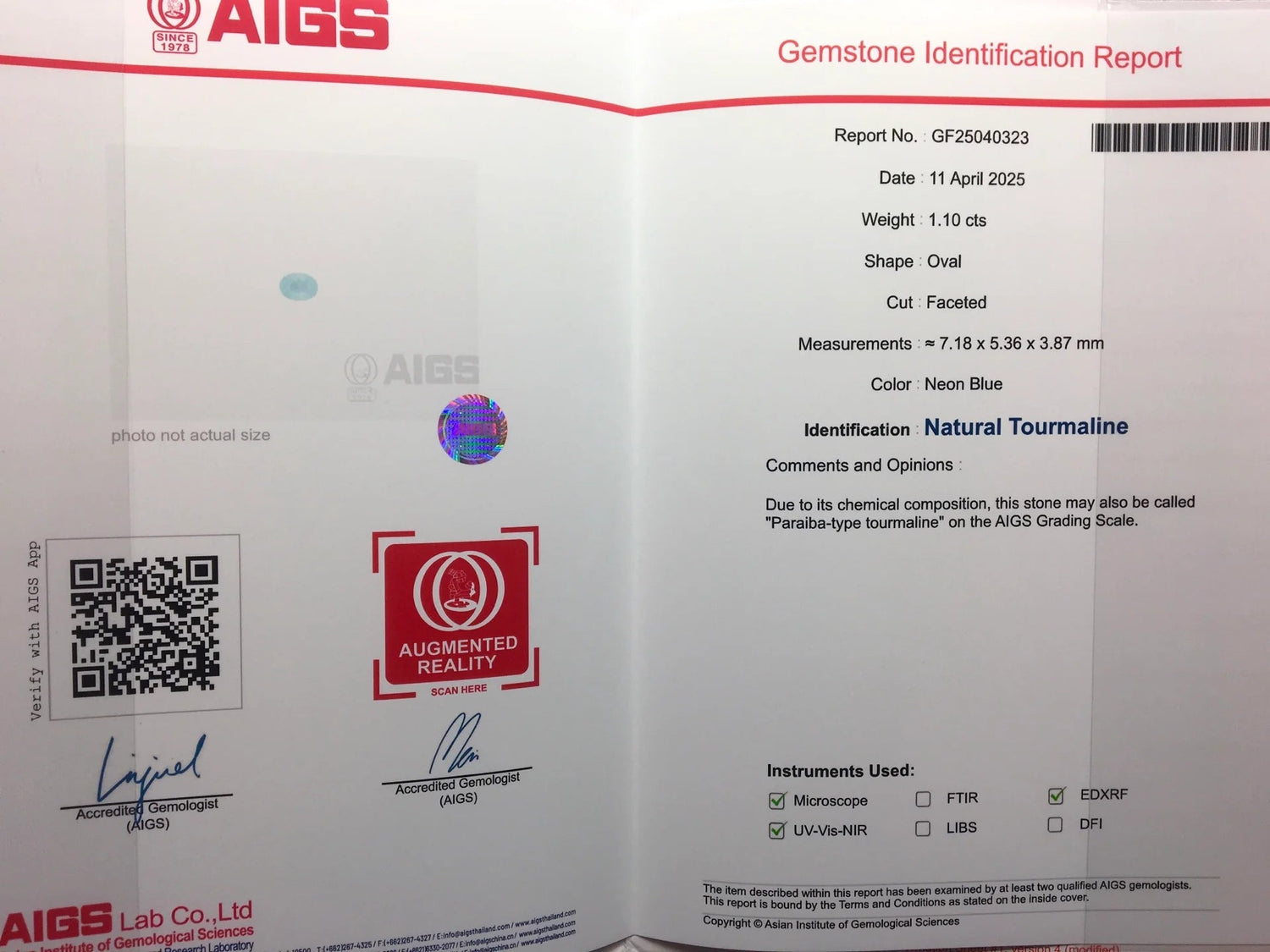 Tento 1,10 karátový paraibský turmalín se pyšní intenzivní neonově modrou saturací s živým ohněm a silným leskem. Brus do elegantního oválného tvaru, kámen má vynikající proporce a Čistota, což mu dodává živý elektrický lesk velmi ceněný sběrateli. Přirozeně vytvořený a neupravený, tento drahokam je dodáván s certifikátem AIGS, který poskytuje nezávislé potvrzení autenticity. Jeho vzácnost a intenzita barvy z něj činí vysoce žádoucí majetek jak pro sběratele, tak pro zakázkovou výrobu šperků.