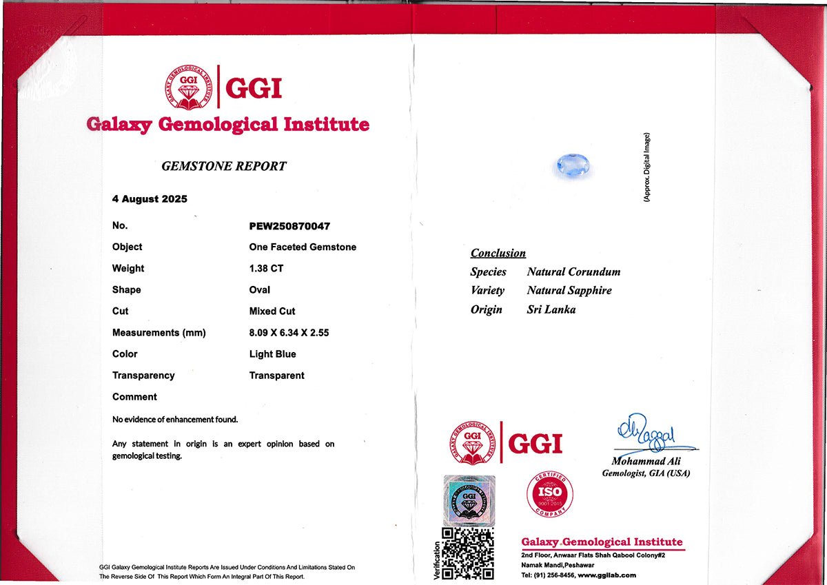 Tento přírodní safír o hmotnosti 1,40 karátu ze Srí Lanky má světle modrý odstín a je vybroušen do oválného tvaru o rozměrech 8,12 × 6,33 × 2,62 mm. Díky čistotě VVS vykazuje velmi dobrou průhlednost a minimální množství inkluzí, což přispívá k jeho čistému vzhledu. Tento safír, který není ošetřený a vznikl přirozeným způsobem, představuje menší, ale atraktivní drahokam, který je vhodný pro sběratele drahokamů nebo pro použití v jemných špercích na zakázku.