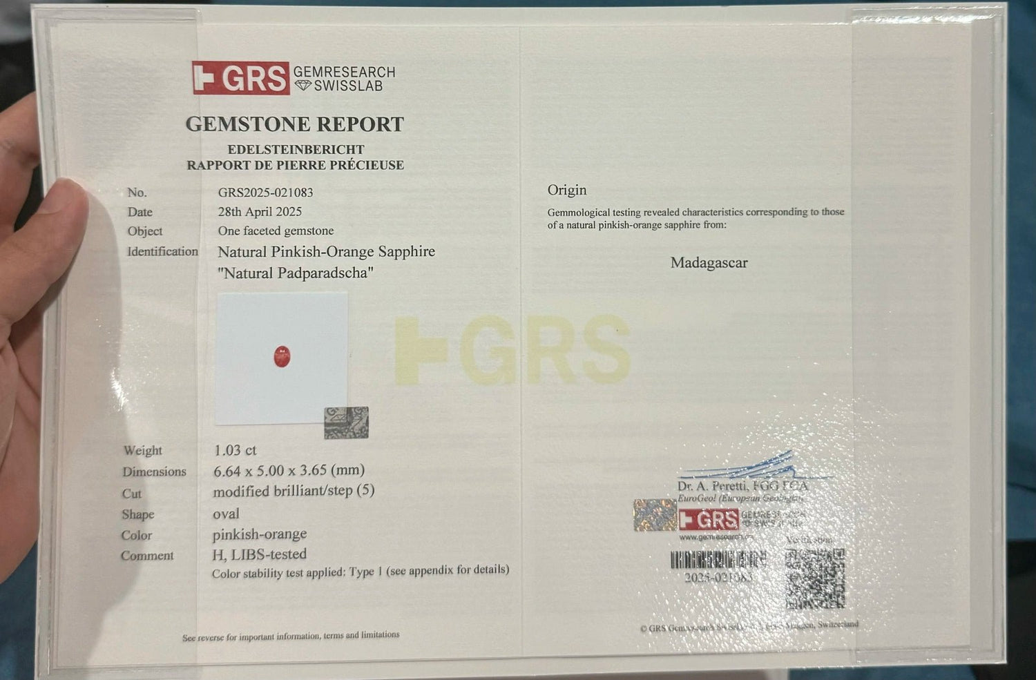 Přírodní padparadscha safír 1,03 ct – ovál Brus, Tepelně ošetřeno, certifikováno GRS