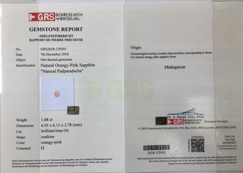 Přírodní padparadscha safír 1,08 ct – polštářek Brus, Tepelně ošetřeno, certifikováno GRS je na objednávku a bude odeslán, jakmile bude opět na skladě.