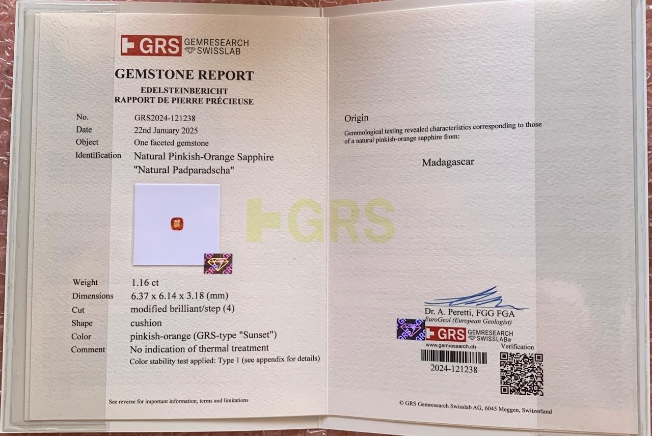 Certifikovaný GIA nebo IGI, dvěma z nejuznávanějších gemologických laboratoří na světě, tento padparadža safír je ideální volbou pro luxusní zakázkové šperky a sběratele, kteří hledají nadčasovou eleganci.