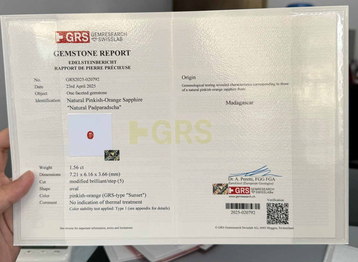 Přírodní Padparadscha safír 1,56 ct – Ovál Brus, Neupravený, Certifikován GRS