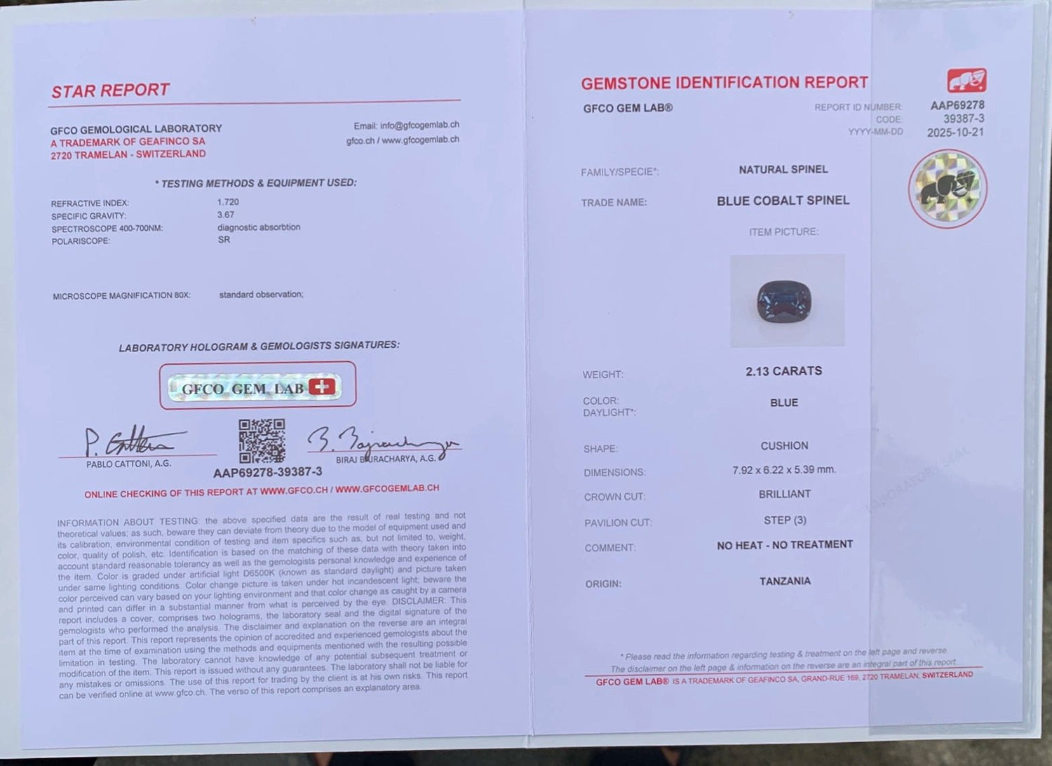 Přírodní modrý kobaltový spinel 2,13 ct – polštářek Brus, neupravený, certifikovaný GFCO