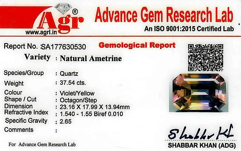 Ametrin 37,54 ct – Fialová/Žlutá, osmiúhelník Brus, AGR Certifikováno