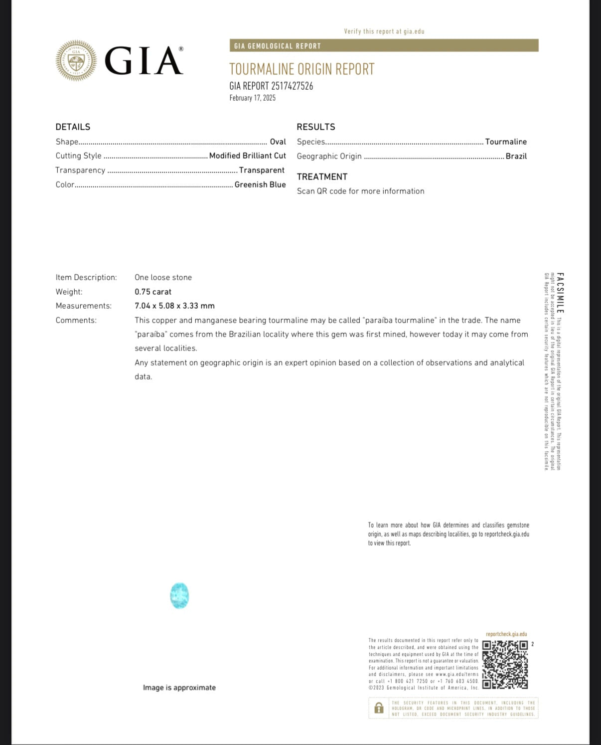 Přírodní Paraiba turmalín 0,75 ct – Ovál Brus, Tepelně ošetřeno, GIA Certifikováno