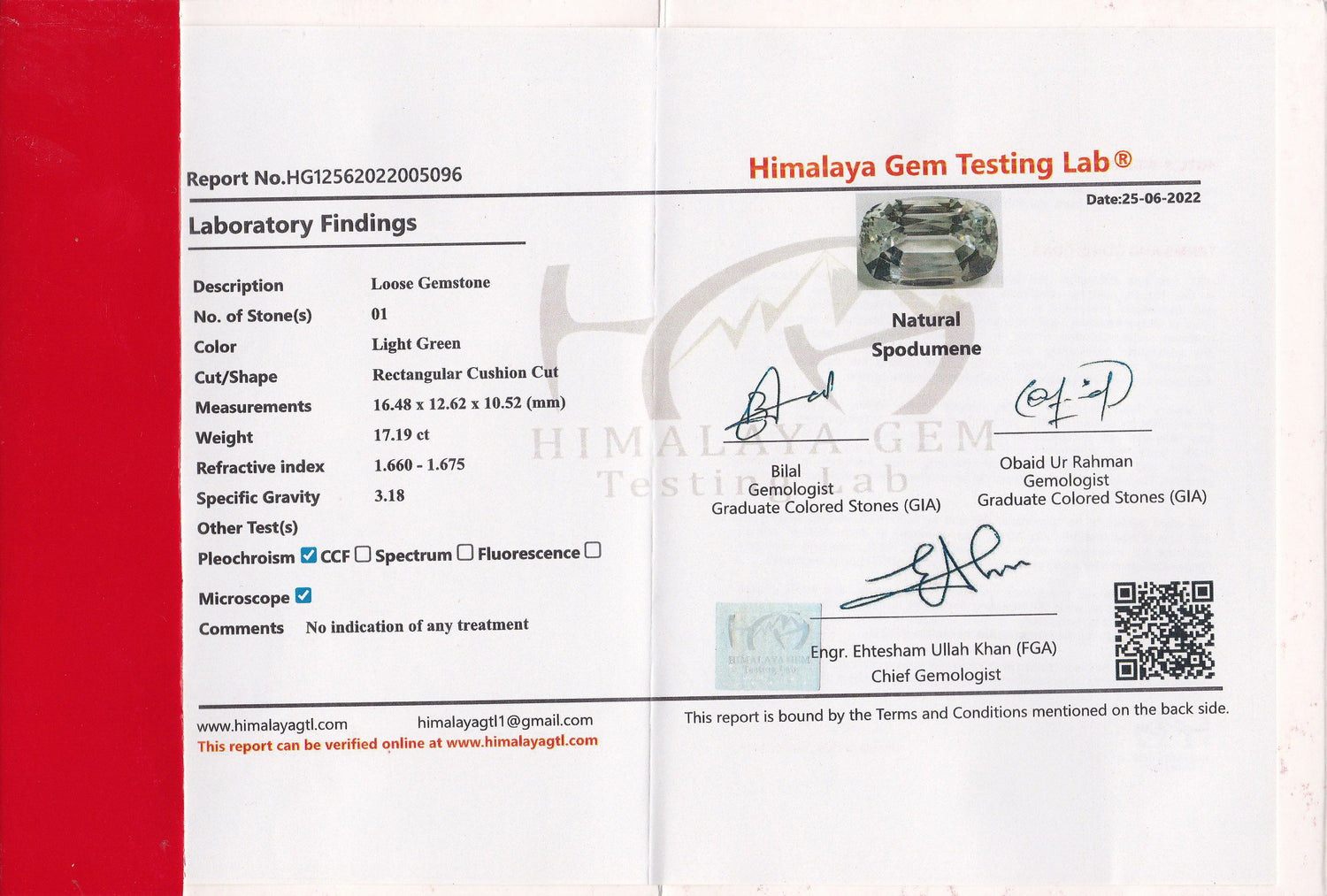 Tento 17,19 karátový přírodní Spodumen z Afghánistánu vykazuje velmi světle zelený odstín a vynikající průhlednost. S VVS Čistota, polštářem Brus a Bez úprav je tento drahokam certifikován HGTL a ideální pro luxusní šperky nebo náročné sběratele drahokamů. Vzácný a vytříbený příklad přírodního spodumenu.