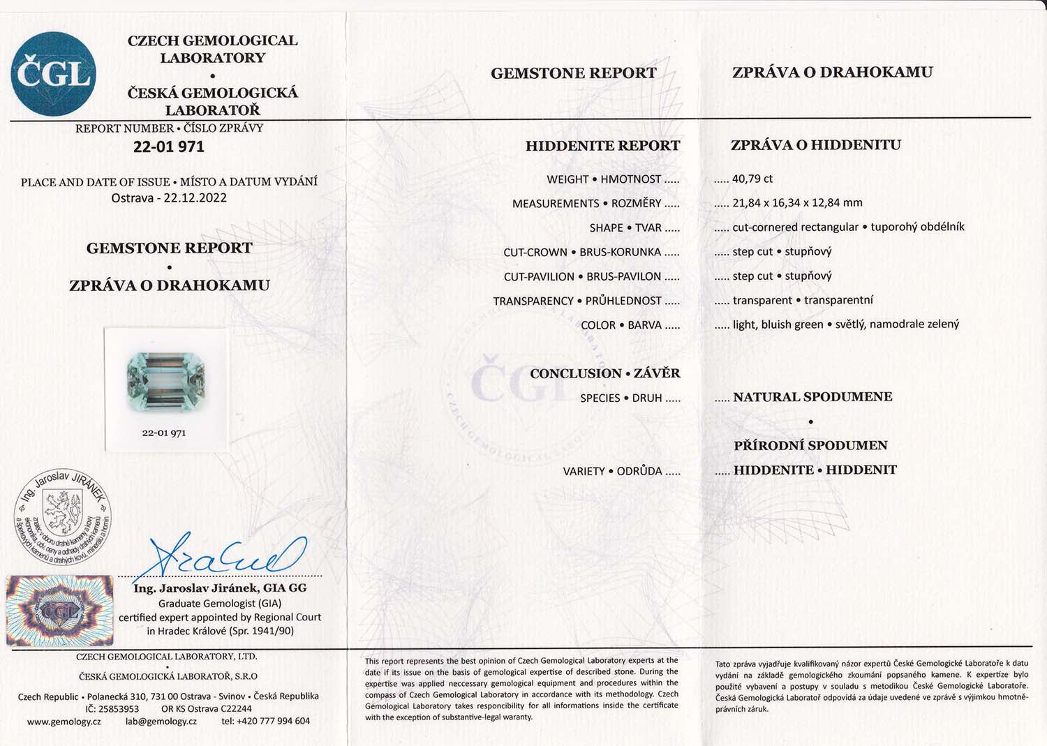 This 40.79 ct spodumene, classified as hiddenite, features a delicate light bluish green tone and exceptional clarity. Cut in an elegant octagonal shape and left completely untreated, the stone showcases the natural characteristics of spodumene in its purest form. Certified by the Czech Geological Laboratory (ČGL), this gemstone is a refined and rare piece suitable for collectors or bespoke gemstone jewelry.